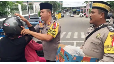 Kapolsek Tpi Barat, Iptu Firuddin saat memberikan Helm pada pengendara