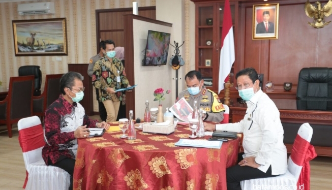Ketua Gugus Tugas Percepatan Penanganan Covid-19 Provinsi Kepri sekaligus Plt Gubernur Kepri, H Isdianto hadiri Rapat Koordinasi Tim Pengarah Gugus Tugas Penanganan Corona Virus Disease 2019 Provinsi Kepulauan Riau di Ruang Rapat Mapolda Kepri, Batam, Jumat (3/4).
