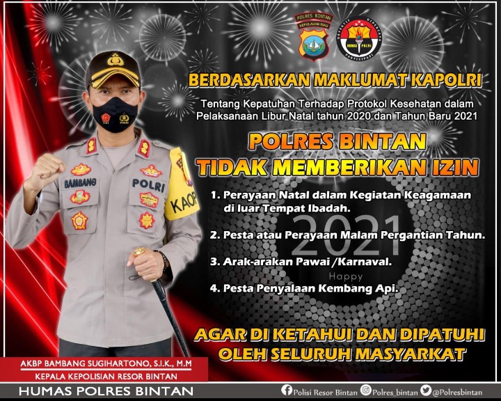 Kapolres Bintan AKBP Bambang Sugihartono menegaskan bahwa maklumat Kapolri Jenderal Pol Idham Azis tentang kepatuhan terhadap protokol kesehatan dalam pelaksanaan libur Natal tahun 2020 dan tahun baru 2021 wajib dipahami dan dipatuhi oleh seluruh masyarakat.