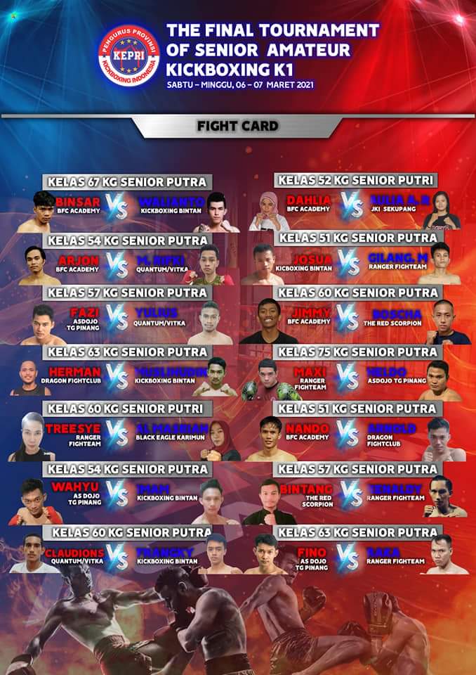 Open turnamen Piala Ketua Umum Kickboxing Provinsi Kepri dan Piala Wali Kota Batam yang digelar mulai 04 hingga 07 Maret 2021 di Grand Mall Batam merupakan Ivent yang cukup bergengsi. Selain para fighter yang bertarung dominan atlit yang berkelas, ada juga yang sudah menjadi petarung One pride MMA.