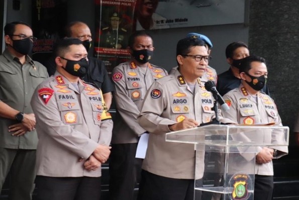 Kadiv Humas Mabes Polri Inspektur Jenderal Argo Yuwono bersama Kapolda Metro Jaya Inspektur Jenderal Mohammad Fadil Imran saat memberikan keterangan surat cekal untuk Rizieq Shihab dan 5 orang lainnya
